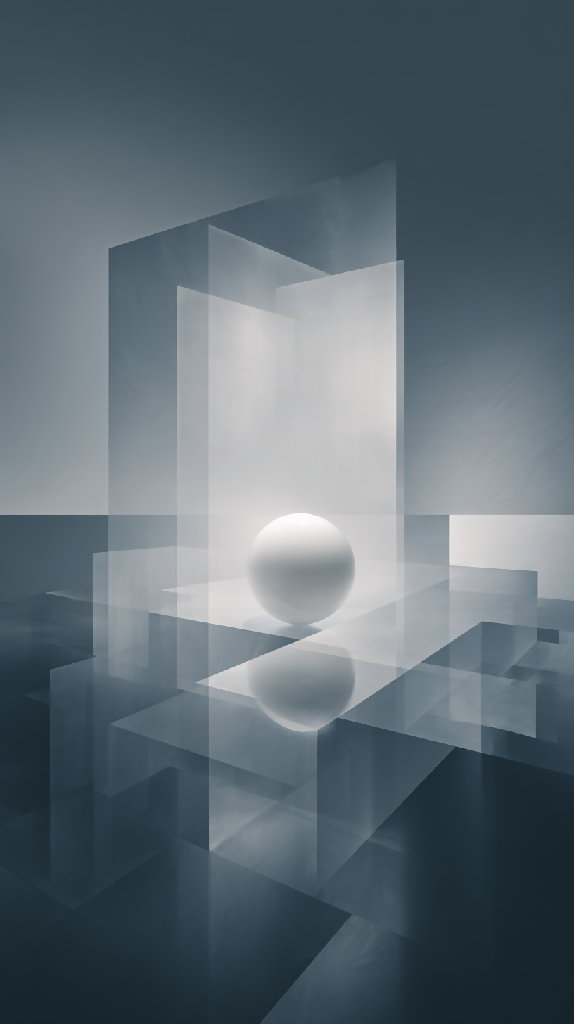 Tags: abstract, digital art, geometric, minimalism, translucent layers, glowing sphere, depth, symmetry, modern design, light and shadow