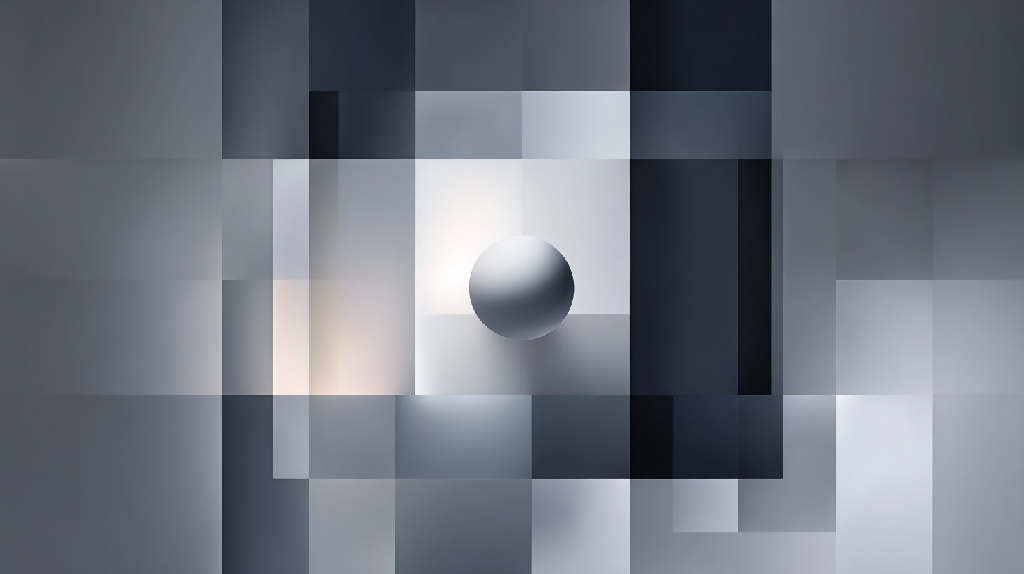 A minimalist yet intricate series of digital abstract artworks that explore the relationship between light, geometry, and spatial perception. Each composition centers around glowing spheres or elliptical forms, surrounded by translucent rectangular planes arranged in layered, symmetrical patterns. The grayscale and blue-gray palettes enhance the sense of depth, while soft lighting and subtle shadows evoke a contemplative, almost meditative atmosphere. This series invites viewers to reflect on the tension between solid form and transparency, structure and ambiguity, within a modern digital aesthetic.