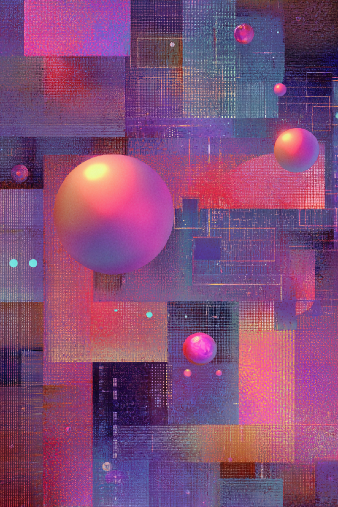 Tags: abstract, digital art, surreal, futuristic, spheres, geometric, grid, vibrant colors, metallic texture, depth, sci-fi, visual effects