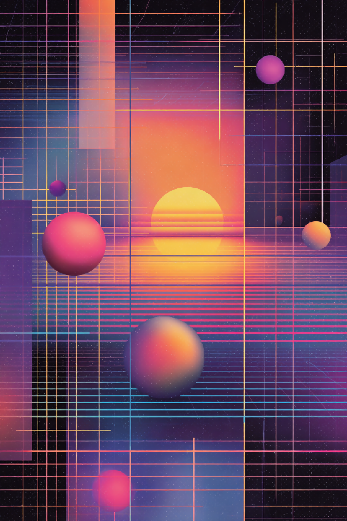 Tags: abstract, digital art, surreal, futuristic, spheres, geometric, grid, vibrant colors, metallic texture, depth, sci-fi, visual effects