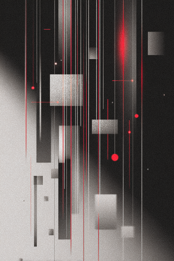 Tags: abstract, digital art, geometric, modern, grayscale, red accents, pink accents, symmetry, pixelated, tech-inspired, layered composition
