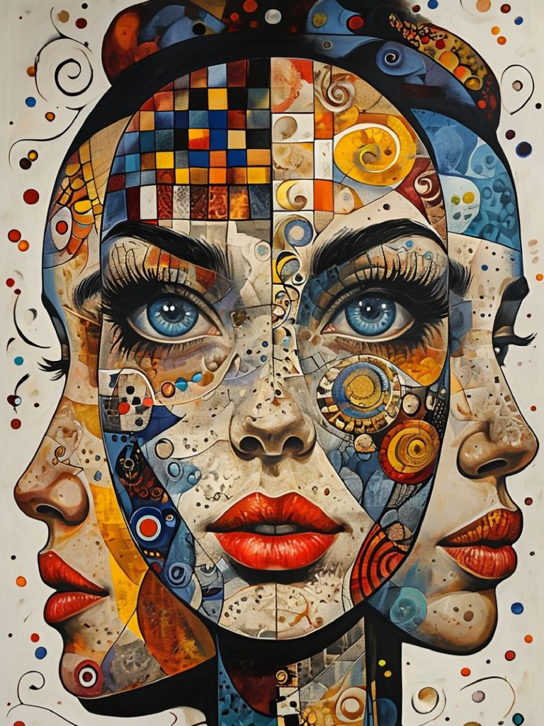 This captivating digital artwork features a surreal triple-face portrait, blending abstract and modern artistic elements. The intricate design includes vibrant patterns, geometric shapes, and a mosaic-like texture, showcasing a blend of creativity and depth. The bright blue eyes and bold red lips create a striking focal point, while the swirling details and colorful accents add movement and dynamism. This unique composition reflects themes of identity, perspective, and artistic expression, making it a perfect choice for art enthusiasts seeking a bold and contemporary piece.