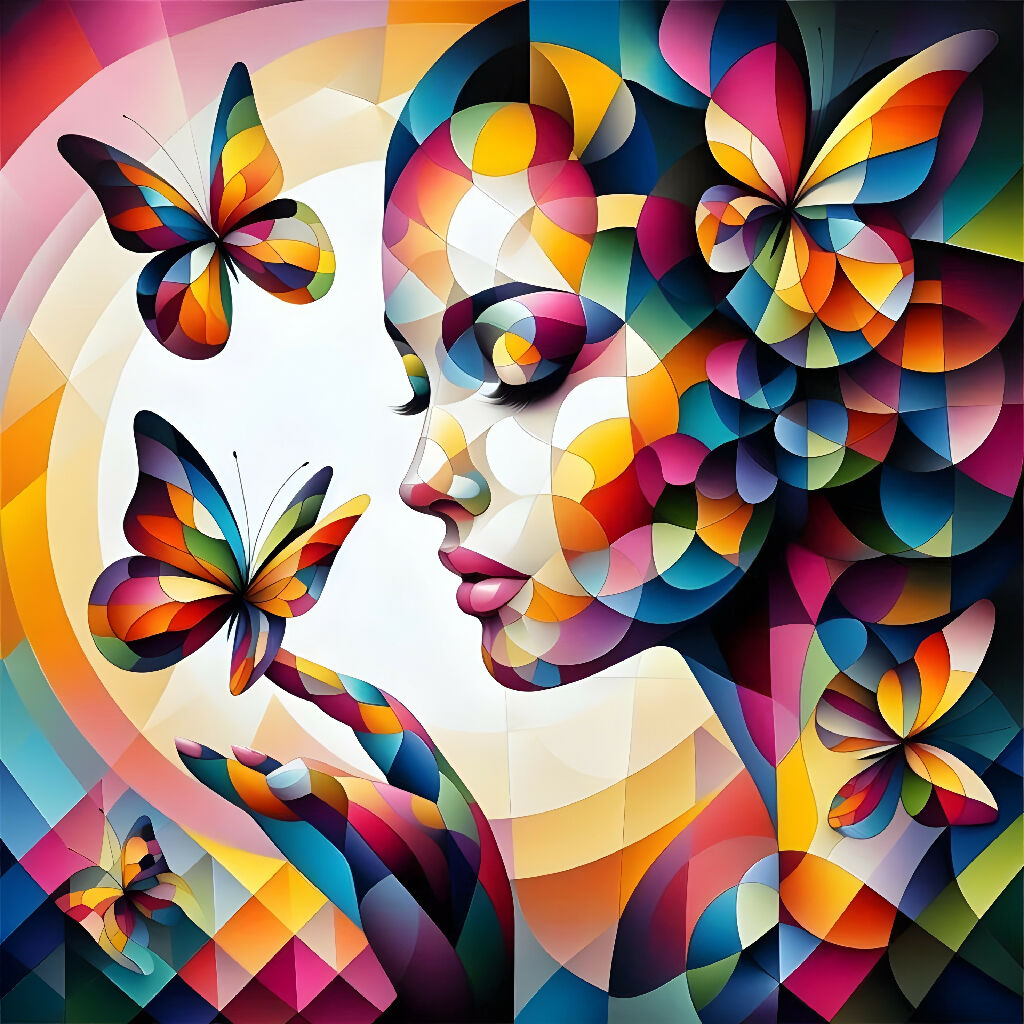 A vibrant and colorful digital artwork featuring an abstract woman surrounded by butterflies. The geometric design highlights bold shapes, vivid hues, and a harmonious blend of colors. This modern composition showcases creativity, elegance, and the beauty of nature, making it a perfect piece for art enthusiasts and collectors.