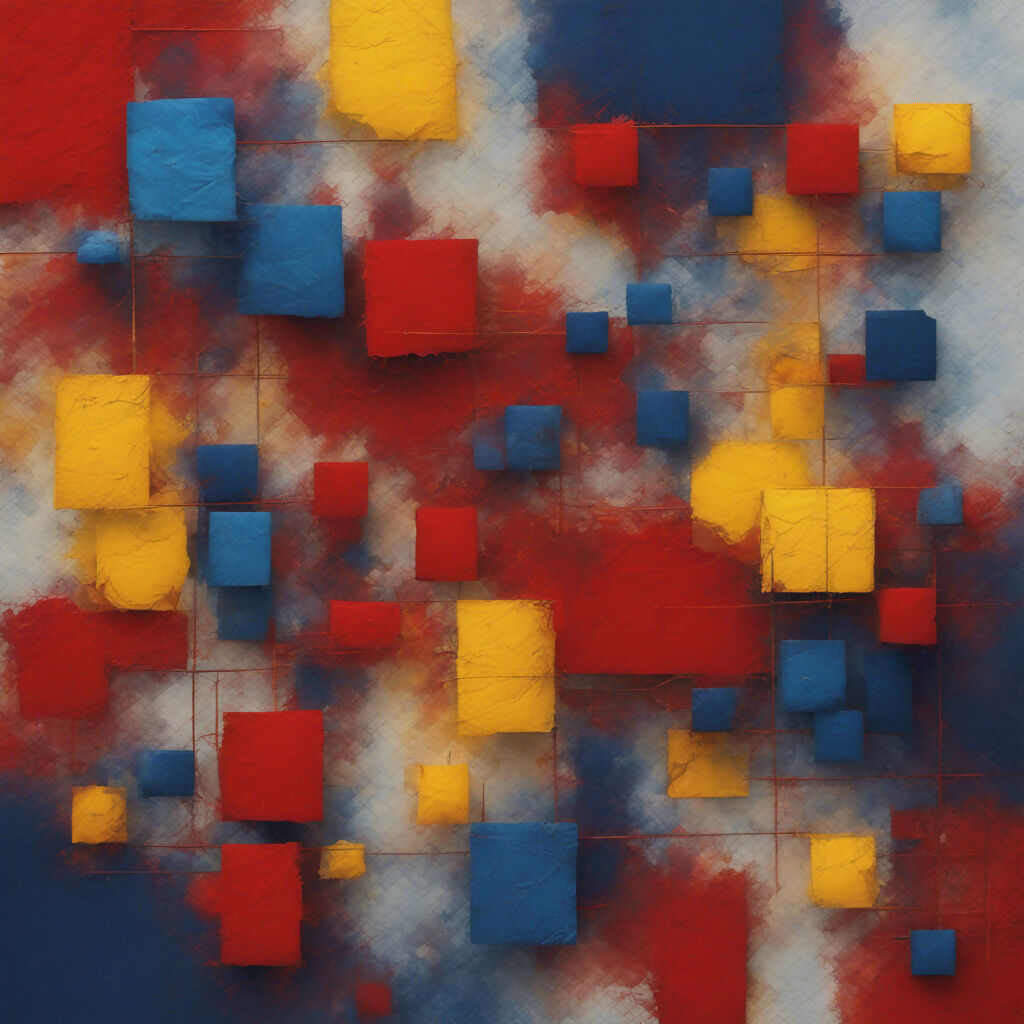 Abstract geometric art with bold floating cubes in red, yellow and blue layered over a textured background, modern cubist style, dynamic energy, 3D effect, fine art painting.