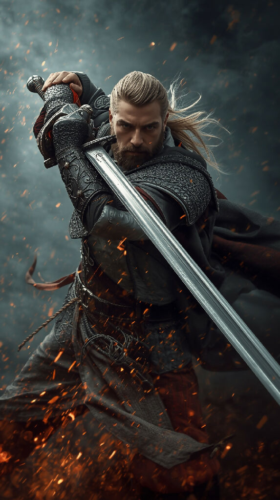 Action Motion Shot Dynamic cinematic angle. The warrior king unsheathes his greatsword in a single sweeping motion, mist scattering and cloak whipping back. Sparks ignite as steel scrapes against the sheath. HDR detail, film still photoreal action realism.