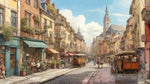 The image features a painting of an old city street scene with people and carriages. The painting portrays a bustling street with various figures and carriages going about their activities. In the center of the image, there is a wooden cart placed on the street. Additionally, there is a specific focus on a carriage with people inside, located towards the right side of the painting. The overall scene captures the vibrancy and activity of a busy city street.