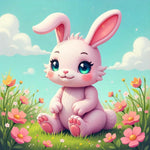 Step into a world of pure charm with this AI-generated masterpiece featuring a sweet, fluffy bunny with sparkling blue eyes, sitting happily in a vibrant spring meadow. The soft pastel tones, delicate flowers, and dreamy sky create a heartwarming and magical vibe, making this artwork perfect for children's rooms, nurseries, or anyone who loves cute and kawaii-inspired art.