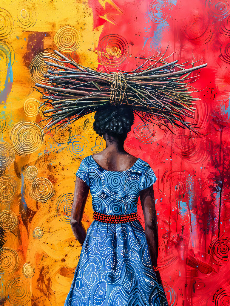 An African woman in colorful dress carrying a bundle of firewood. A vibrant depiction of daily life and traditional tasks