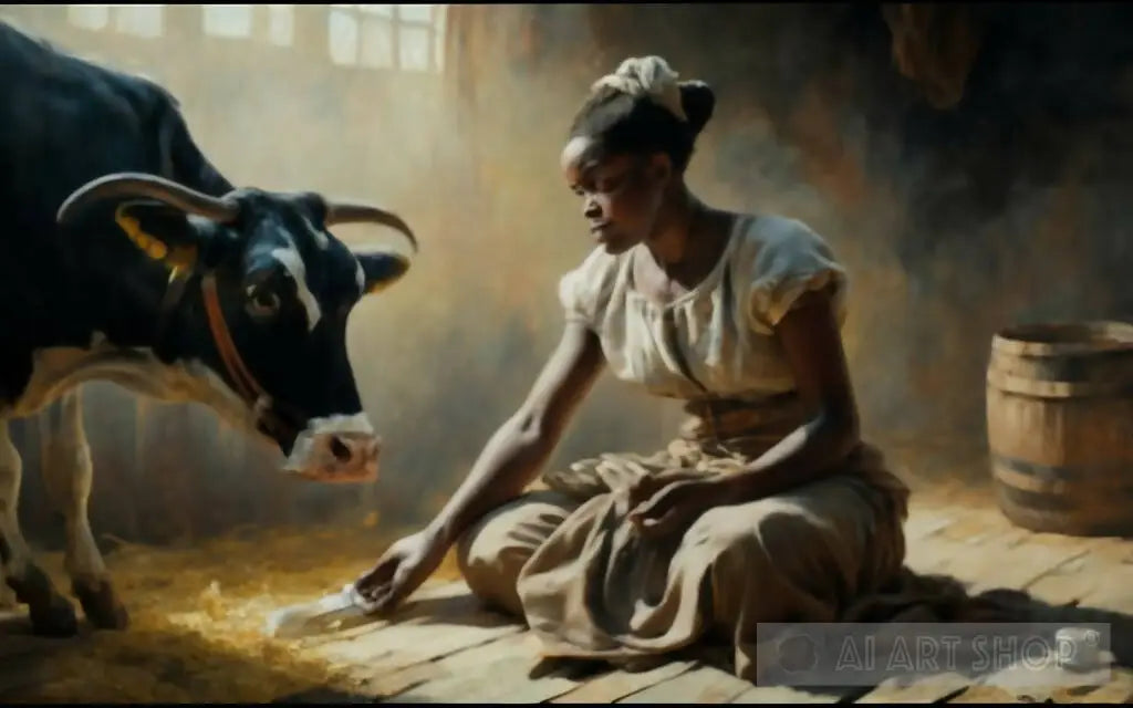 Vintage oil painting close up of a very beautiful, well defined black African woman sitting on the floor milking the cow vintage, black lined graphite art, basement, marquette art, dynamic side view, stunning eyes, cinematic lighting, early morning sunrise, illustration, print ,dark fantasy portrait photography,cinematic,3d rendering,image,poster,cinematic,illustration,3d rendering,print,photo, cinematic, illustration, 3d render, typography
