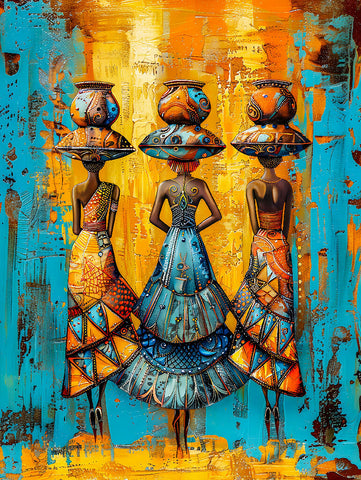 Three African women in bright, traditional clothing carrying water jugs. A colorful depiction of essential daily tasks and cultural heritage.