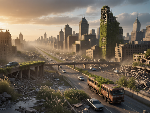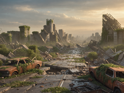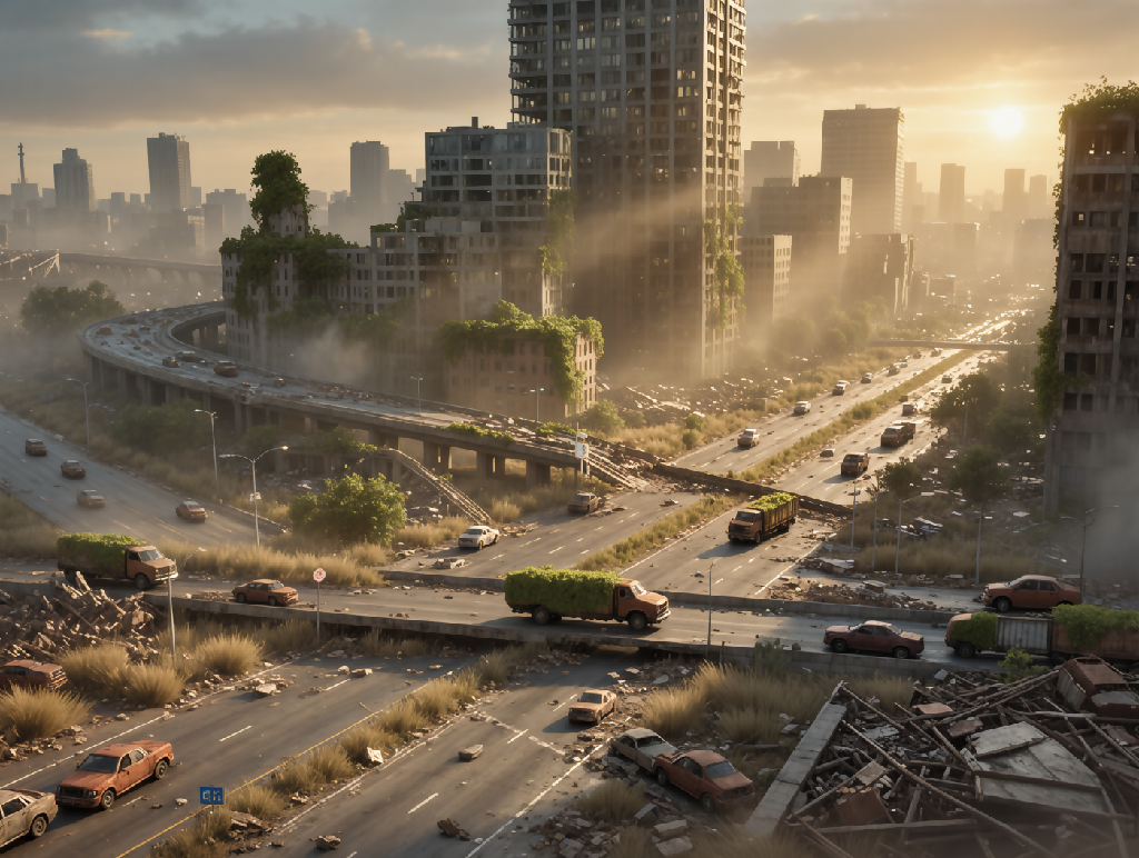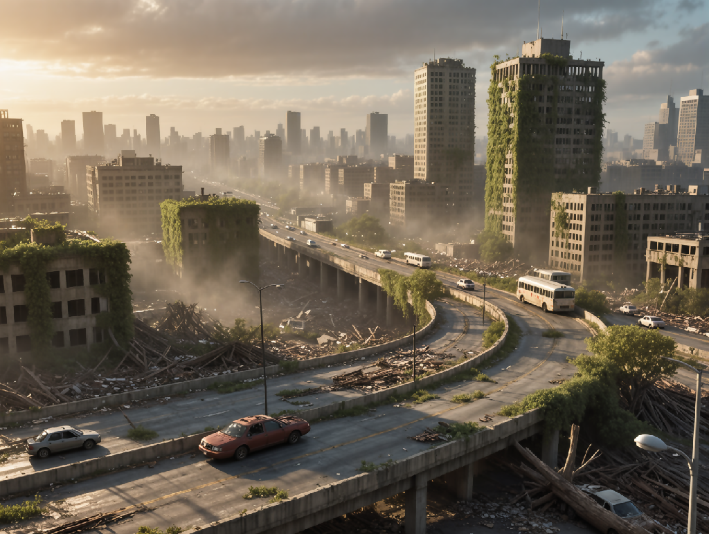 Sunbeams pierce the ruins of a once-thriving megacity, now swallowed by moss and mist. Crashed cars and crumbling towers paint a haunting portrait of survival and time’s passage. Designed for cinematic prints, concept art, and future-noir aesthetics.