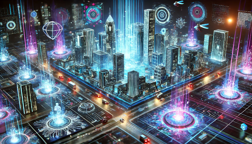 The image of a futuristic city with Holographic data visualizations Integrated into its design, Featuring glowing skyscrapers, Is augmented reality in a Vibrant cyber punk Atmosphere. High resolution.