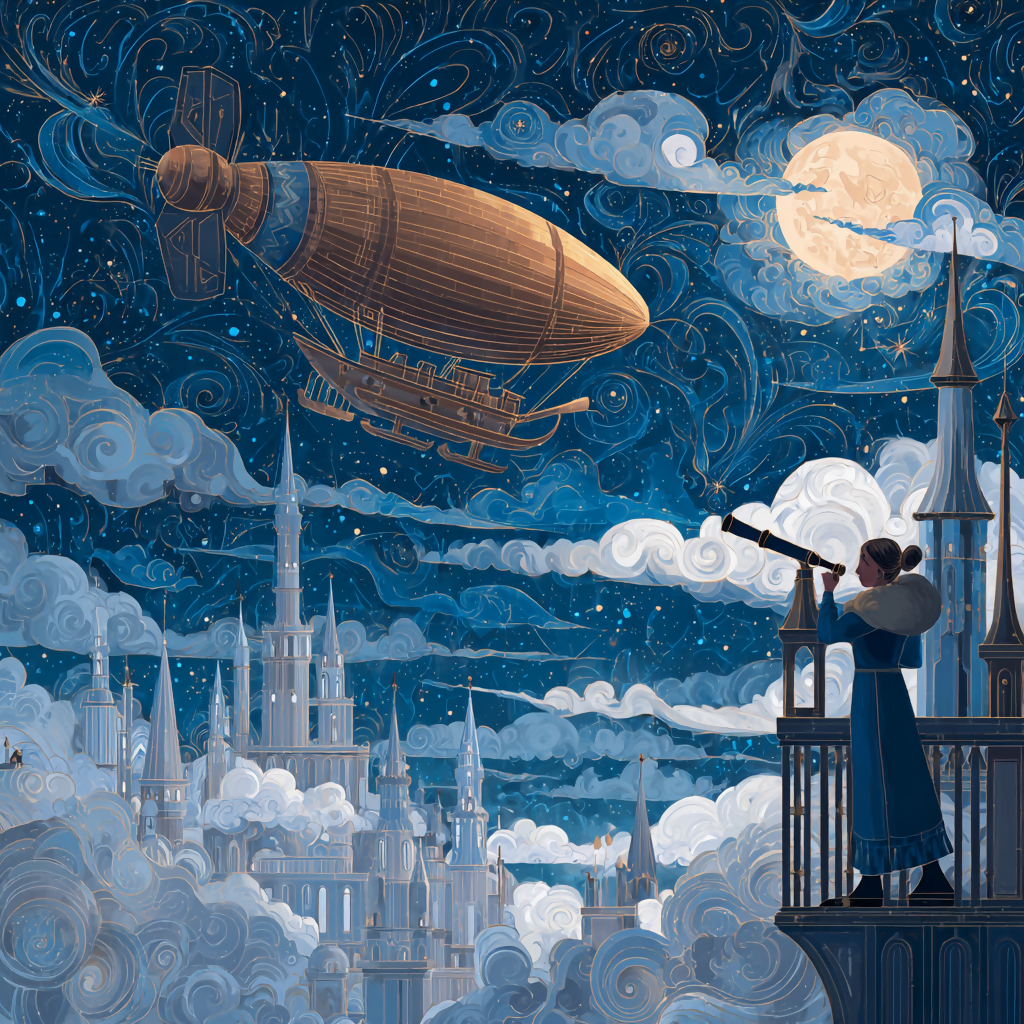 An elegant airship of polished wood and shining brass glides through the crystal night air. Below lies a sleeping city with white towers, bathed in the soft, silvery light of a giant moon. On the deck, wrapped in a warm cloak, stands a dreamer. She peers into the infinity of space through a vintage telescope, perhaps searching for new worlds or making a most secret wish.