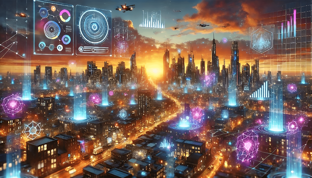 Here is a image of a futuristic city with holographic data visualizations integrated into its design.