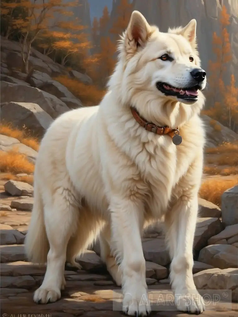 (Alabai or Central Asian Sheperd dog breed) majestic in a mountainous landscape, exuding strength with a fierce gaze, captured by a skilled realist artist. Utilize warm morning light to enhance the photorealistic details, emphasizing the orange tones for a vibrant and lifelike portrayal. Employ a digital medium to achieve a high-quality and detailed animal portrait.