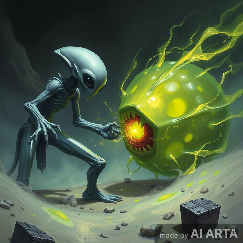 “Futuristic artwork showcasing a sleek alien figure in a mysterious standoff with a glowing, orb-like creature radiating energy. The piece blends sci-fi wonder and cosmic tension, capturing a moment of connection—or confrontation—between two otherworldly beings. Perfect for collectors and fans of extraterrestrial art, this design embodies power, curiosity, and the unknown in a visually striking style.”