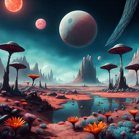 A surreal alien landscape with glowing flora, towering mushrooms, twin moons, and vivid terrain. Perfect for sci-fi art fans, fantasy worldbuilders, or wallpaper use.