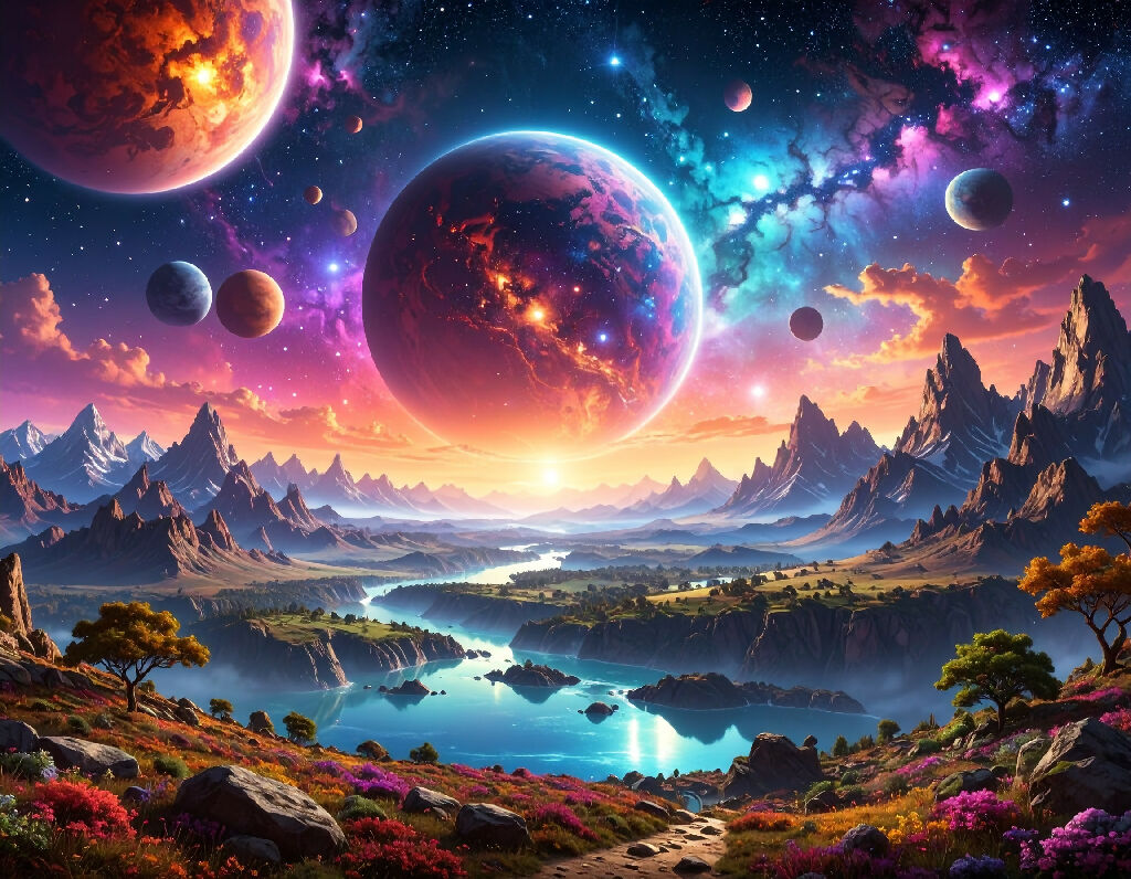 A surreal alien planet with colorful rocky terrain, glowing skies, and multiple moons, creating a sci-fi fantasy world.