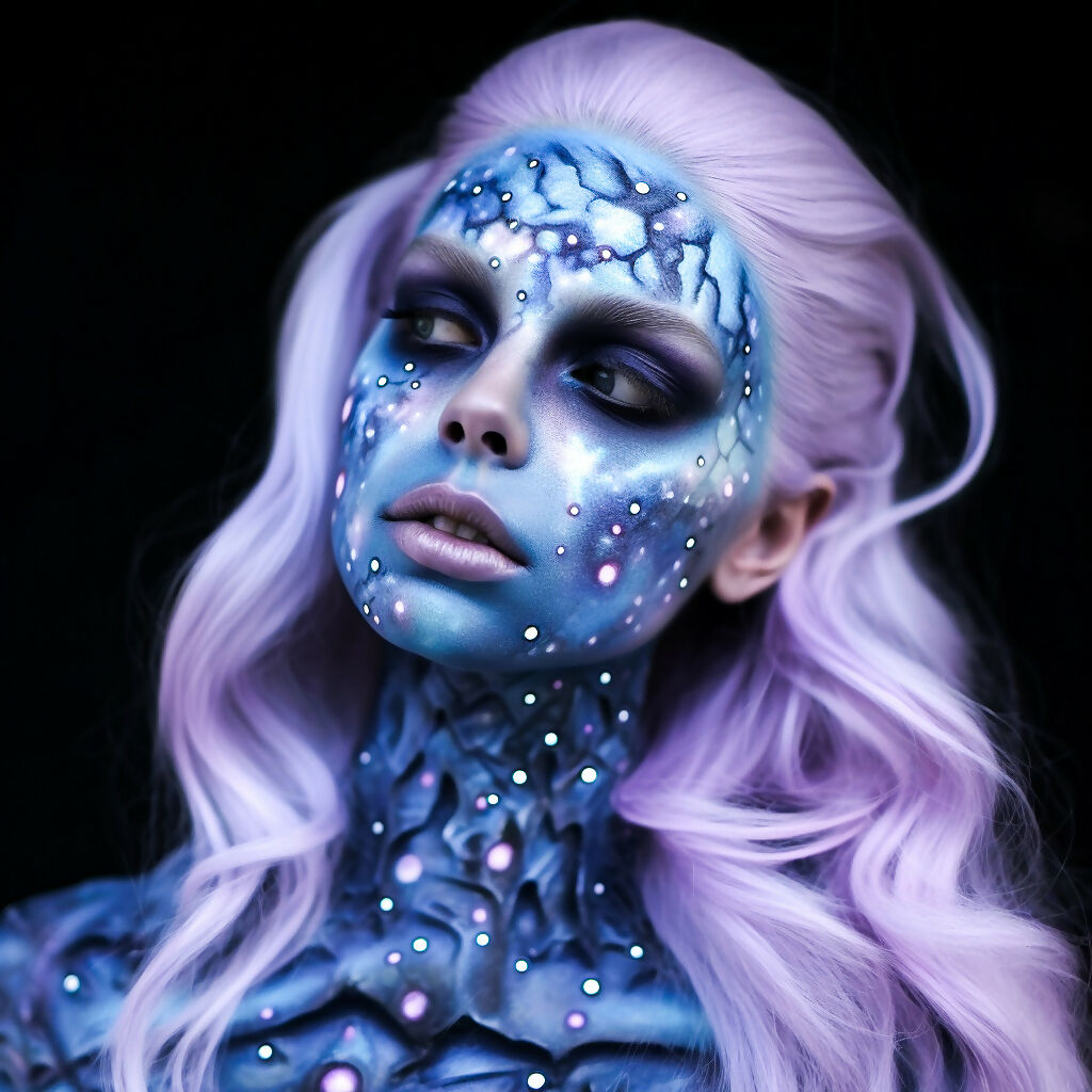 This stunning creation features an ethereal, otherworldly woman with striking, alien features. Her smooth, luminous skin shimmers with holographic hues, reflecting a spectrum of colors that shift and change with the light. Intricate, futuristic patterns adorn her face, blending seamlessly with the holographic elements to create a mesmerizing, cosmic effect. Her gaze is both serene and enigmatic, evoking a sense of wisdom and mystery. Set against a backdrop of swirling galaxies and starry skies, this artwork captures the beauty and intrigue of a futuristic, alien aesthetic, perfect for adding a touch of otherworldly elegance to any space.