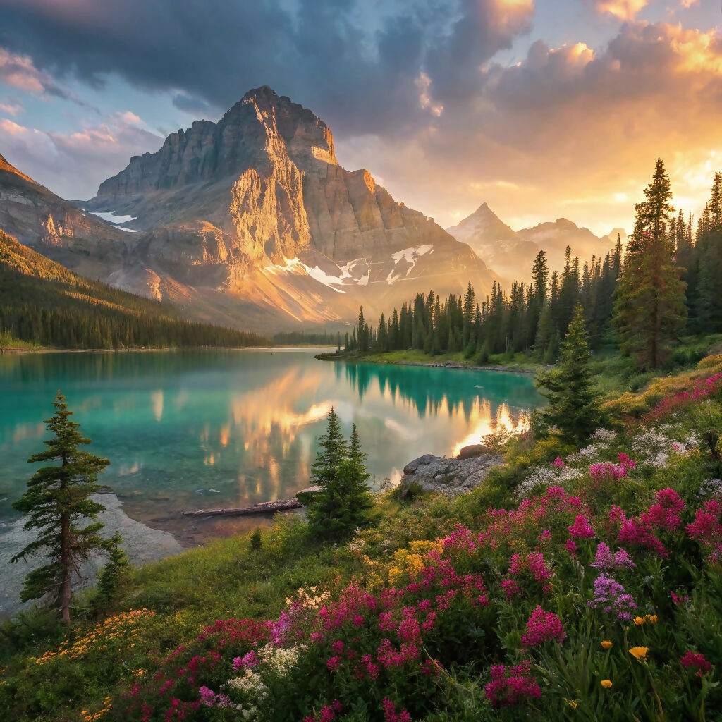 The shoreline is carpeted with a profusion of wildflowers in shades of pink, purple, and yellow.  A mix of evergreen trees, primarily dark green pines and firs, line the lake's edge, creating a dense forest.