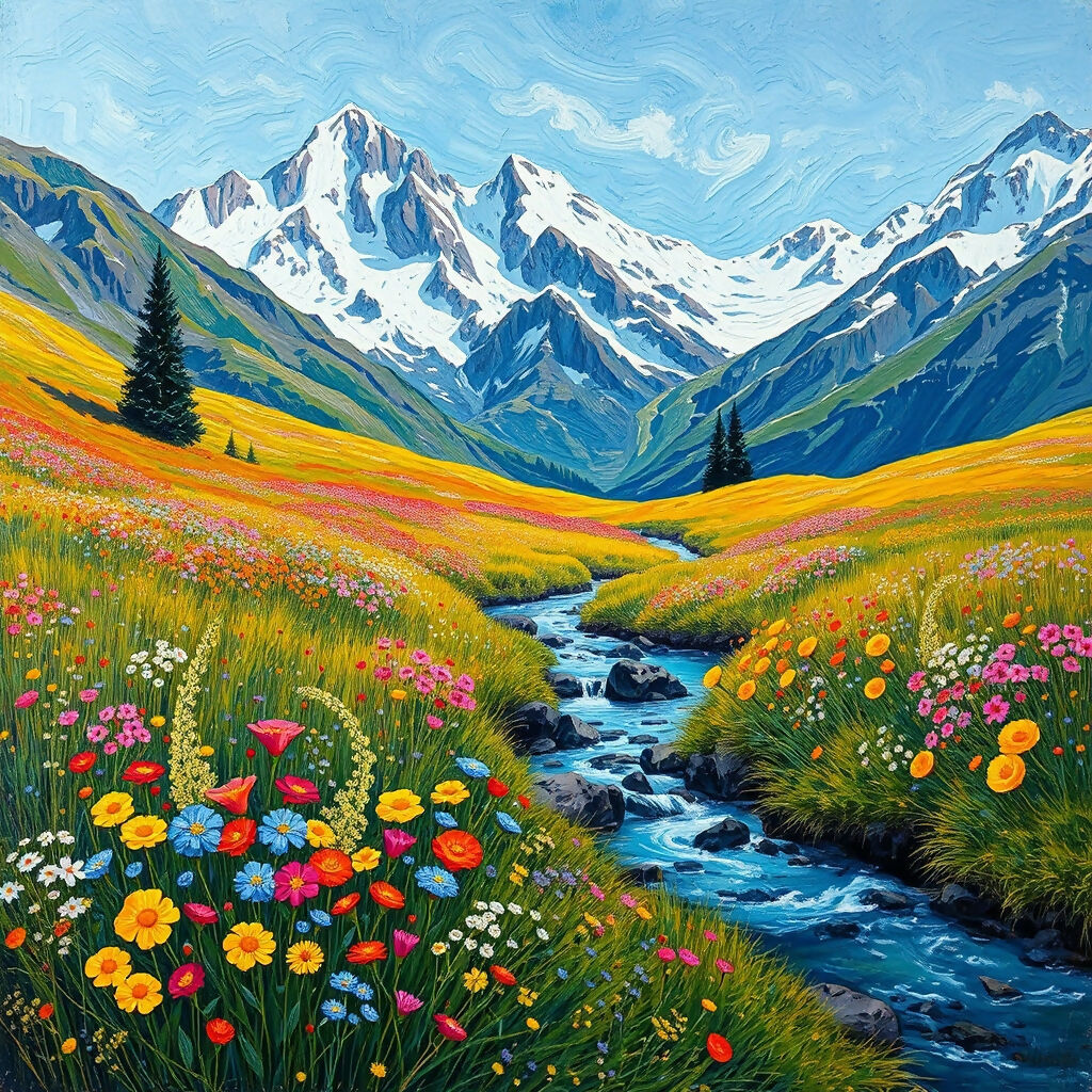 A vibrant high-altitude meadow, dotted with a dense carpet of colorful wildflowers, unfolds beneath a bright sky. Majestic, snow-capped mountain peaks form a dramatic backdrop in the distance. A clear, crystal-cold mountain stream meanders through the meadow, its waters reflecting the blue sky and adding a sense of serene motion to the scene.