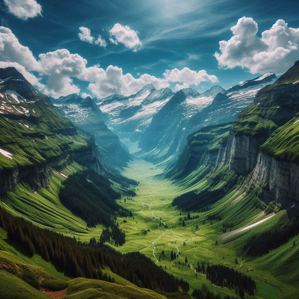 A striking image of a beautiful Swiss valley, with lush green meadows and a snow-covered peaks.