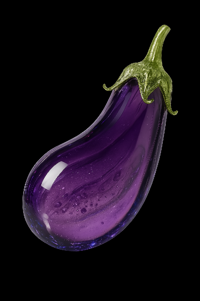 A hyperreal digital portrait of an eggplant sculpted in shimmering crystal. Deep violet glass curves catch the light against a black studio backdrop, elegant, surreal, and gallery-worthy.