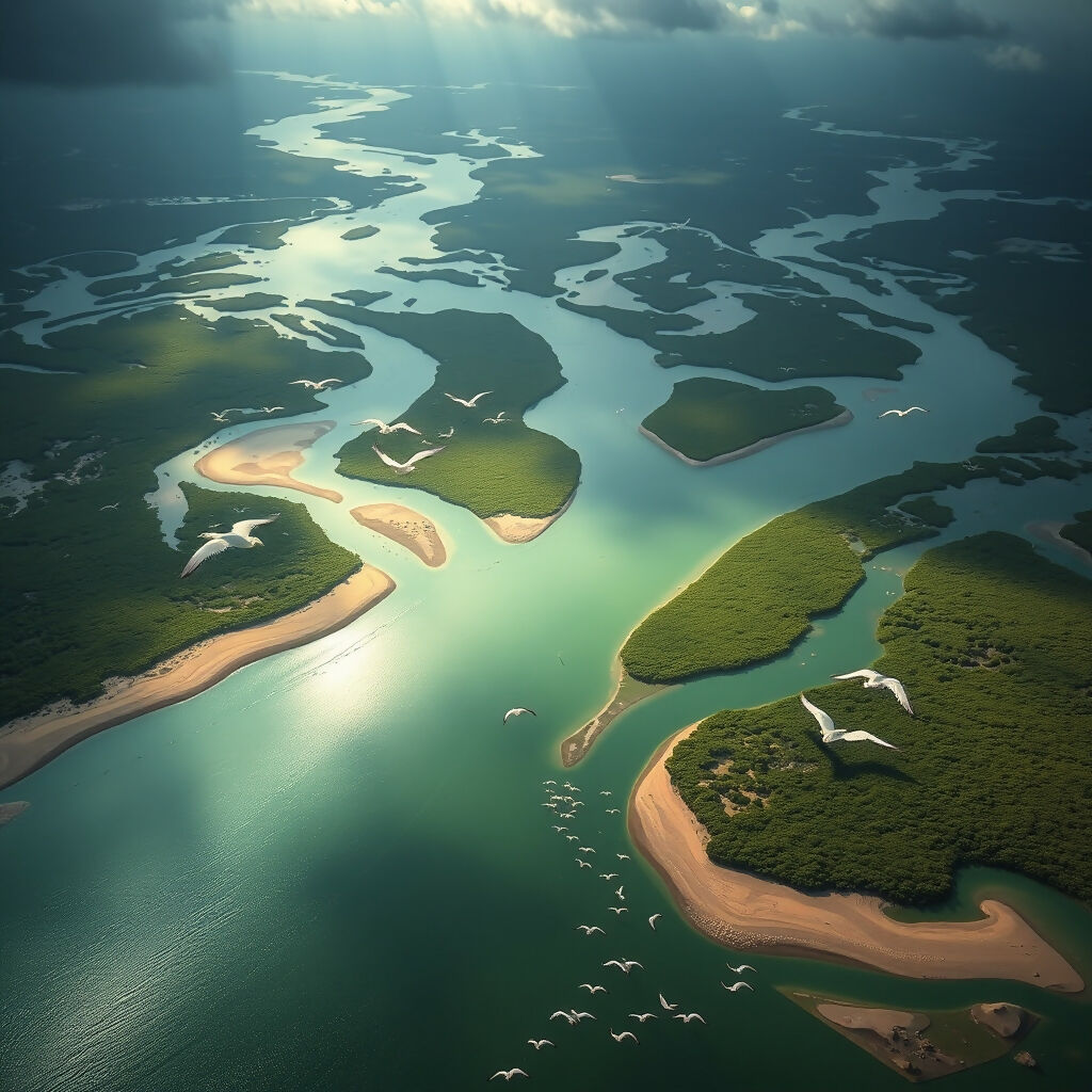 An aerial view of a winding river delta