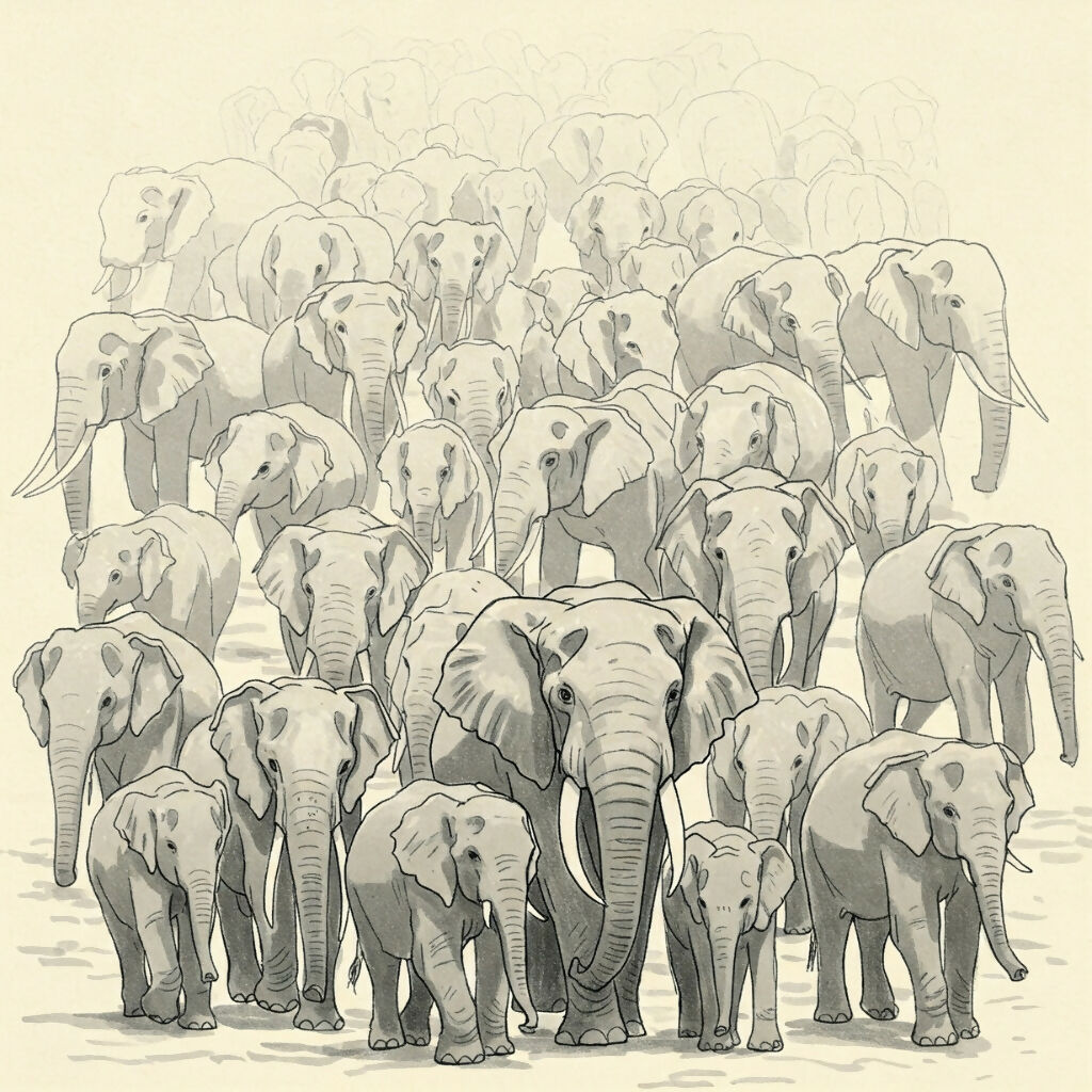 This is a unique piece of art that captures a majestic scene of a vast herd of elephants. The elephants are depicted in a style that emphasizes the repetition of forms and simple lines with subtle shading, creating a powerful visual impression of their immense number and unity. The artwork focuses on the aesthetics of shapes and composition, where the elephants are arranged in a deliberate overlapping manner, utilizing perspective to enhance the sense of depth and multitude. The elephants in the foreground are drawn with clearer details, while the details of the elephants in the background fade, guiding the viewer's eye towards the heart of the herd.