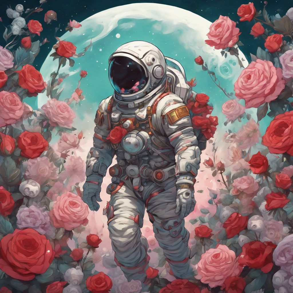 An astronaut floats in space surrounded by vibrant roses against a backdrop of the moon.