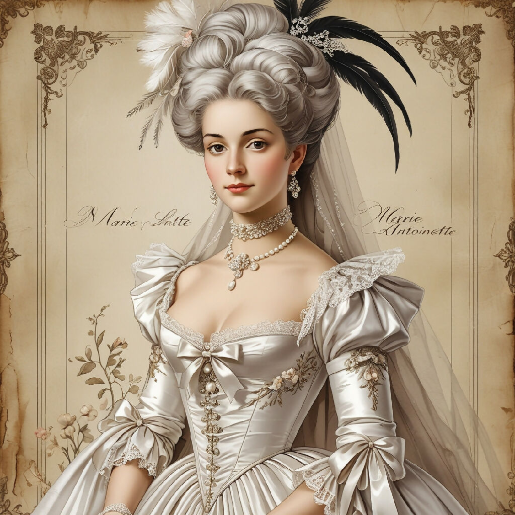 An elegant Rococo-style illustration of Marie Antoinette, drawn in the style of antique fashion books from the 18th century. She is wearing an extravagant white silk gown adorned with lace, ribbons, and delicate floral embroidery. Her hair is styled high in an elaborate powdered updo with feathers and pearls. The background resembles aged parchment, with faint decorative borders and handwritten calligraphy. The overall tone is soft, detailed, and vintage, capturing the romantic and ornate essence of the Rococo era.”