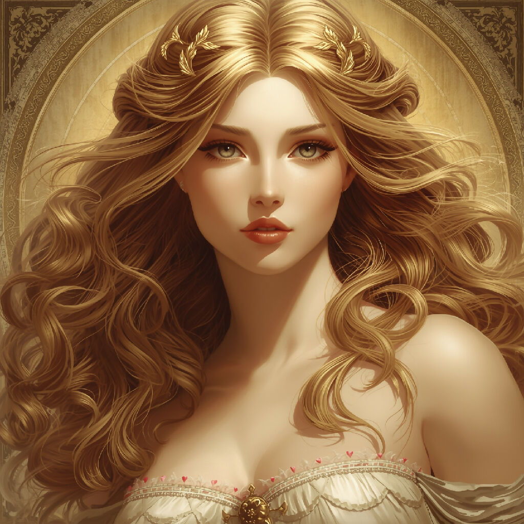 An exquisitely regal anime style stately Aphrodite-like goddess, her presence radiates warmth and allure as if she were inviting viewers into an eternal embrace. Her flowing golden locks cascade around her flawlessly sculpted features, enhancing the ethereal beauty of her porcelain skin. This mesmerizing portrait, likely a meticulously crafted painting, captures every delicate detail with breathtaking precision. The artist's skill expertly conveys the goddess's power and passion, making it a truly captivating and visually stunning masterpiece.