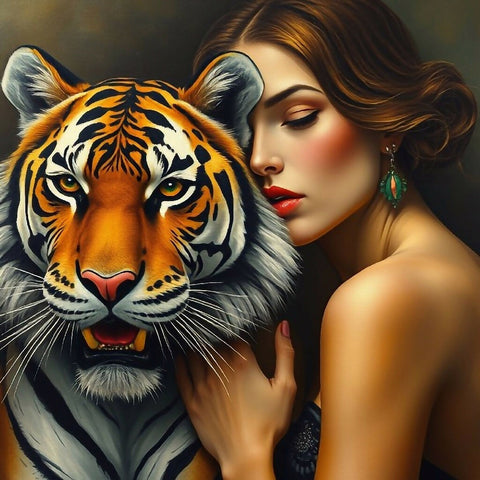 An impressive portrait of a beautiful woman standing gracefully next to a majestic tiger. The woman exudes elegance and confidence while dressed in a stylish outfit that enhances her natural beauty.  Overall, this image conveys an intriguing blend of grace and ferocity that celebrates the strength and beauty of both protagonists. It invites the viewer to admire the special connection between man and animal and to enjoy the majestic aura of this scene.