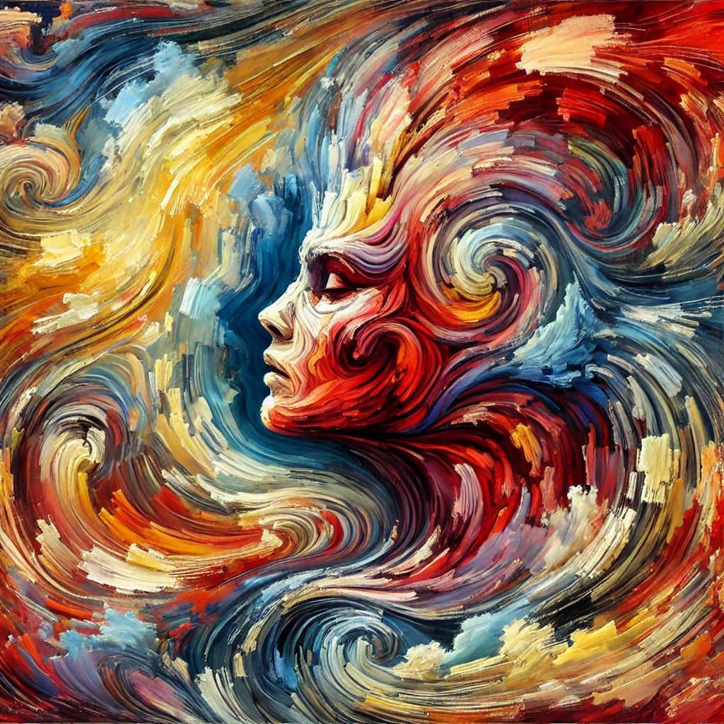 An Unparalleled Masterpiece in Expressionism" is an evocative and intricate artwork that captures the emotional spectrum through vivid colors and dynamic textures. The painting features abstract human-like forms that emerge from and dissolve into swirling strokes of fiery reds, cool blues, and vibrant yellows. Each brushstroke embodies raw emotion, portraying the intensity and beauty of the human spirit. The composition is a blend of chaos and harmony, creating a piece that is as thought-provoking as it is visually striking. Perfectly curated and trend-sensitive, this high-resolution artwork radiates sophistication and innovation, making it a timeless addition to any art collection