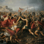 “Ancient Battle Glory” captures the intense and chaotic energy of historical warfare. This painting portrays a vivid scene filled with dynamic movement, as soldiers clad in traditional armor engage fiercely with their adversaries. The attention to detail in the armor and weapons, along with the expressive poses of the figures, evoke a sense of realism and immersion into this bygone era. In the backdrop, a castle stands atop a hill under an overcast sky, adding to the dramatic atmosphere of this moment frozen in time.