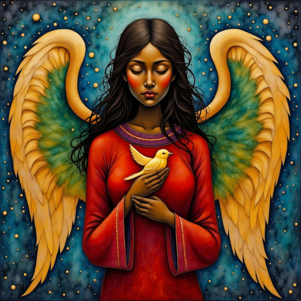 This painting portrays another angel, again with a red dress, but this time with a slightly sheer look. She has dark skin and dark hair. Her golden wings have a different texture. She is holding a small yellow chick to her chest, and her eyes are closed. Behind her head is a circle of warm light and in the background, a blue starry sky.