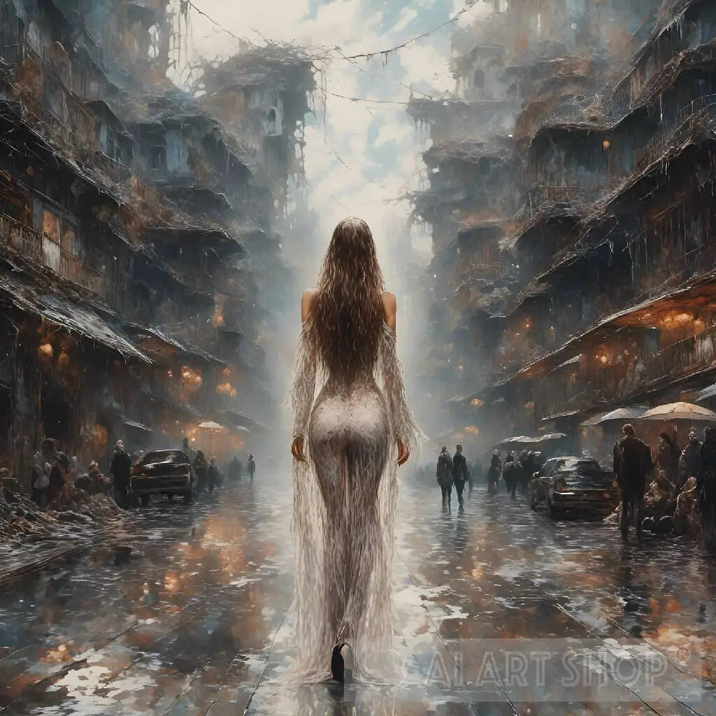 Devastation. This war torn city is in recovery. In the street emerges a beautiful woman, like an Angel from the light behind her, she brings hope and warmth to the struggling community ahead of her. How can she help? What will she find? Is she really there? Positive thoughts, a future ahead, however glim it may be right now.