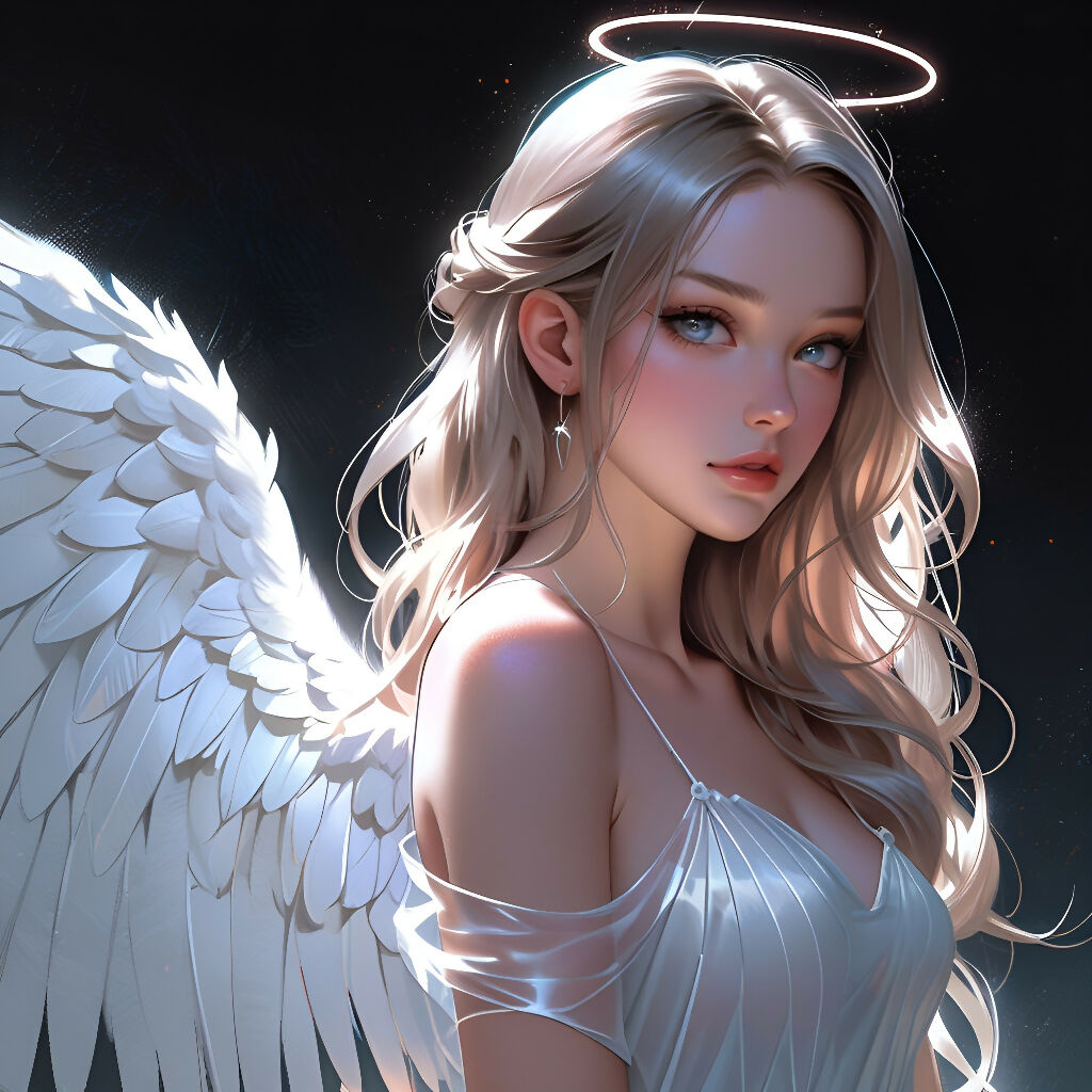 The image features a woman adorned with white wings and a halo, depicting an ethereal or angelic appearance. The artwork showcases her human face and captures elements of fashion and beauty. It highlights the artistic blend of fantasy and reality, using CG techniques to enhance her presence.
