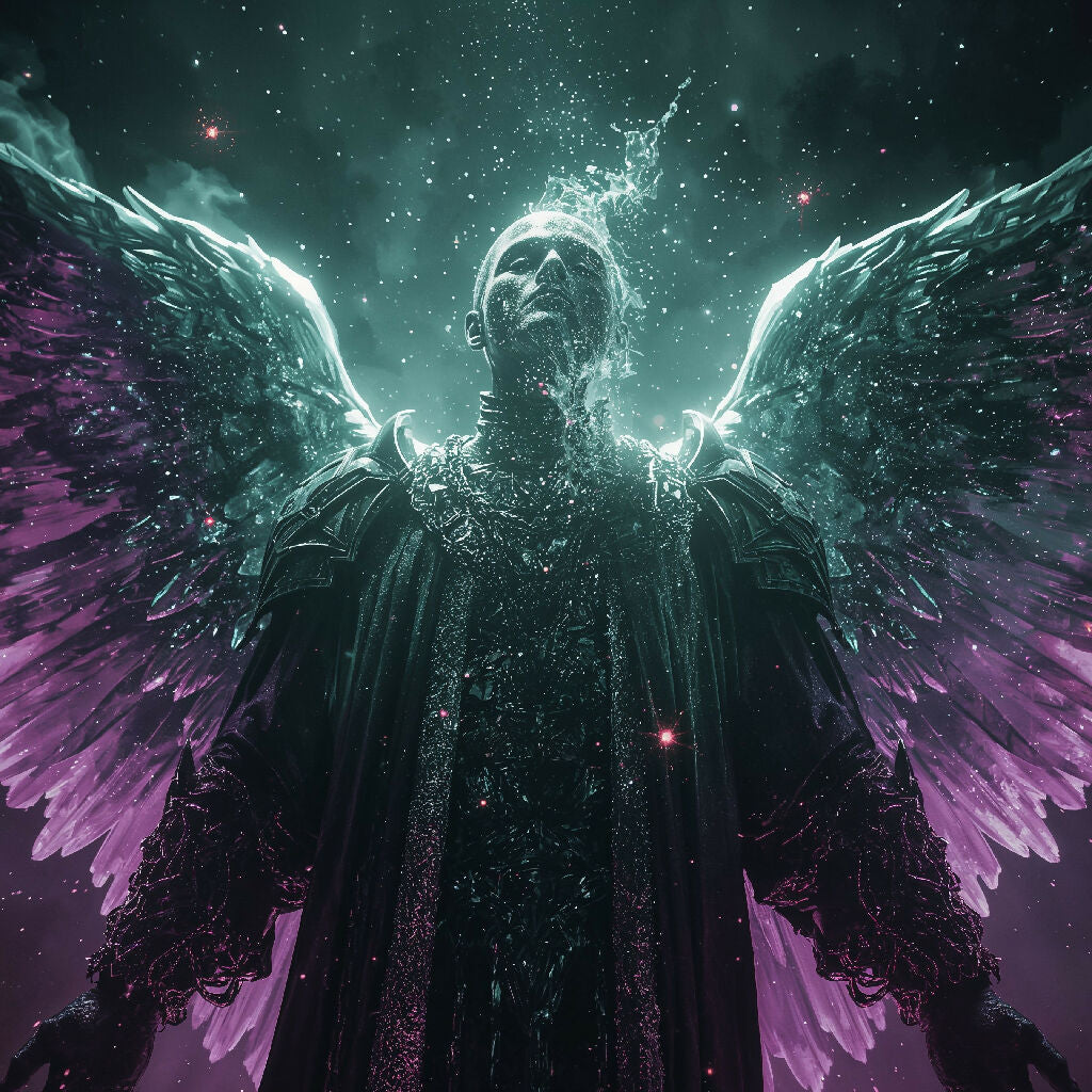 Massive wings unfurl against stellar backgrounds, their feathered forms dissolving into cosmic particles. The figure's upturned face receives celestial light while chains of mortality fall away. This composition explores angelic transformation—the moment between earthly bondage and divine transcendence, rendered through fragmenting matter and luminous ascension.