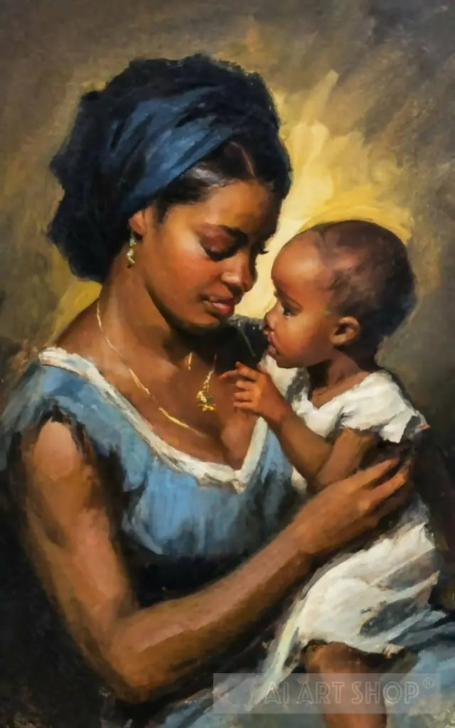 Antique oil painting of an African woman with her little girl