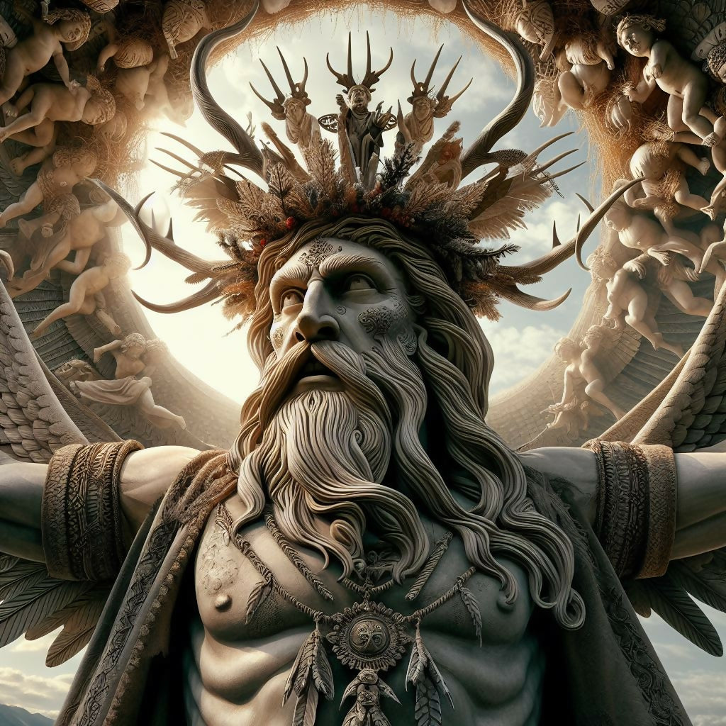 Tags: antler crown, mythological figure, nature deity, fantasy sculpture, feathers, medallion, human forms, ancestral art, divine guardian, ethereal.
