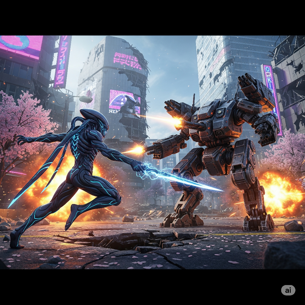 A highly detailed image of an alien and an AI robot in a dynamic battle in the ruins of a futuristic Tokyo. The alien, with glowing blue veins, battles a heavily-armored robot amidst crumbling skyscrapers, neon signs, and cherry blossoms.
