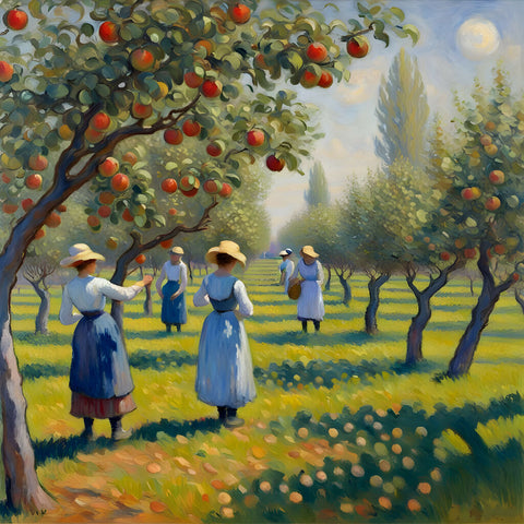 heavy with bright red apples, bends gracefully over the grass, shedding some of its bounty. Around it, several individuals dressed in colorful rural attire are engaged in the task of collecting the fallen fruits. [option two of 'apple orchard']