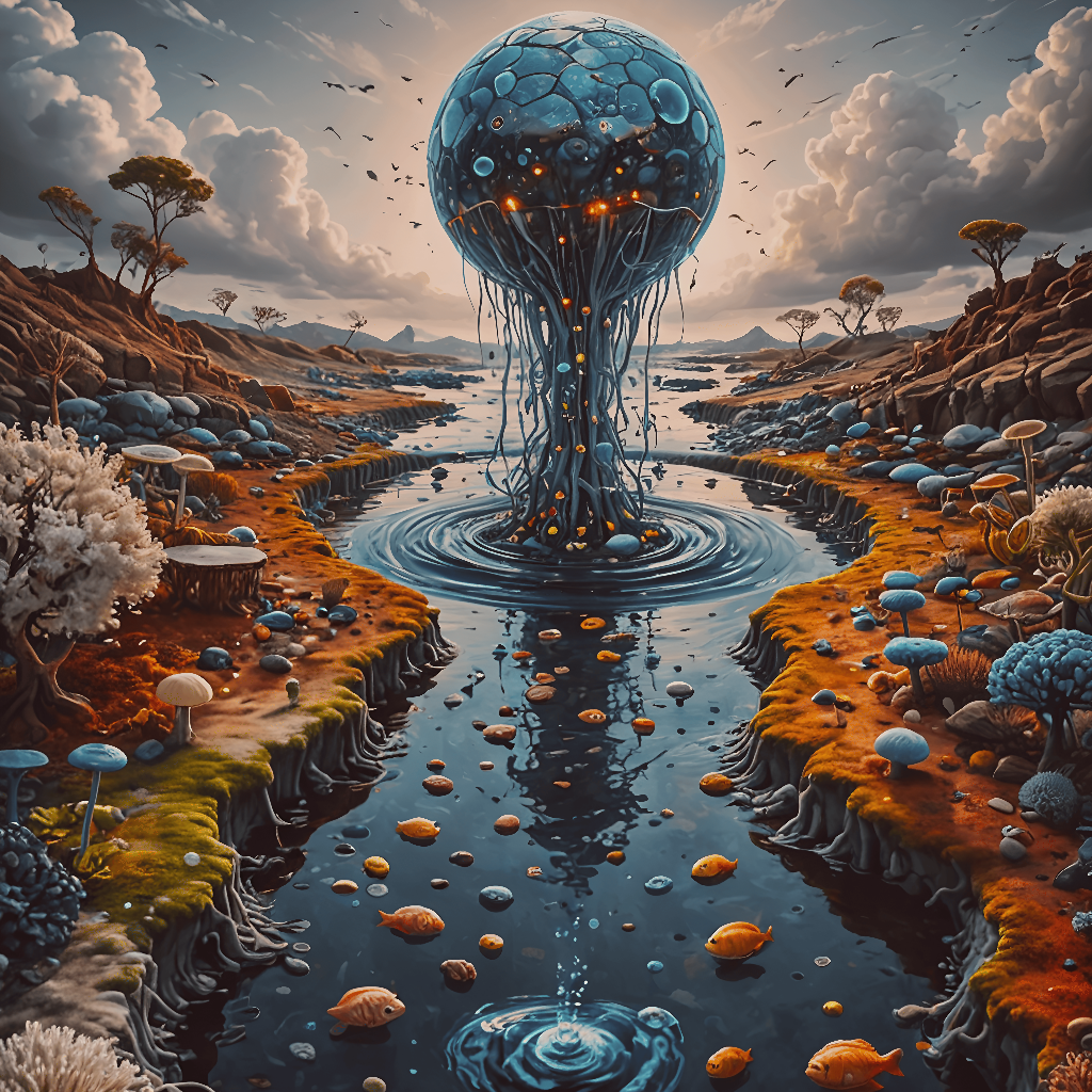 “Aqua Symbiosis” is a captivating digital artwork that transports viewers to an ethereal realm where land and water converge under the watchful presence of majestic, otherworldly jellyfish structures. This piece merges the familiar with fantasy, featuring an array of terrestrial flora alongside aquatic elements and floating fauna, all bathed in a harmonious palette that balances warm earthy hues against serene aquatic blues.