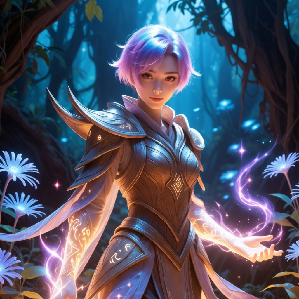 Arcane Whisper: Violet Enchantress – Exclusive one-of-a-kind AI-generated digital artwork. A powerful young sorceress with short lavender-purple hair stands in an enchanted twilight forest, her intricate silver-blue armored robes glowing with ancient runes. She channels swirling violet arcane energy and sparkling magic from her outstretched hands, surrounded by luminous blue wisps, floating petals, and glowing white-blue flowers. This high-resolution original radiates mystery, inner power, and ethereal grace—perfect for fantasy lovers, gaming setups, meditation corners, or as a striking digital focal point.