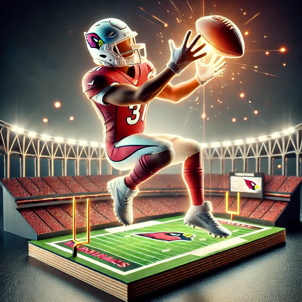 Experience the ultimate fusion of sports and art with this electrifying Arizona Cardinals 3D collectible! Featuring a dynamic football player mid-catch, glowing with energy and intensity, this stunning display piece brings the thrill of the game right to your space. Crafted with vibrant detail, a miniature stadium base, and illuminated goalposts, it's the perfect centerpiece for any Cardinals fan, sports enthusiast, or collector. Elevate your game-day setup and celebrate your team with this one-of-a-kind masterpiece—get yours today before they're gone!