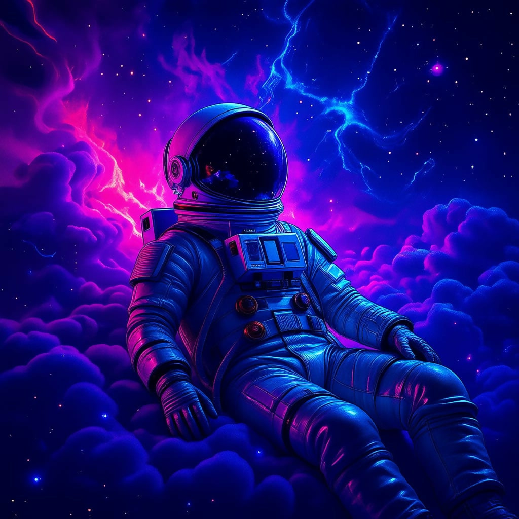 The illustration portrays a surreal, cosmic scene where an astronaut reclines atop a swirling sea of vibrant, ethereal clouds. The palette bursts with deep purples, blues, and pinks, interwoven with twinkling stars and a luminous nebula in the background. The astronaut's sleek suit reflects the otherworldly glow, blending seamlessly with the dreamlike landscape, evoking a sense of peaceful exploration in an infinite, fantastical universe. 'Arrived' explores the future in detail for viewers to decide where we can arrive as a whole.