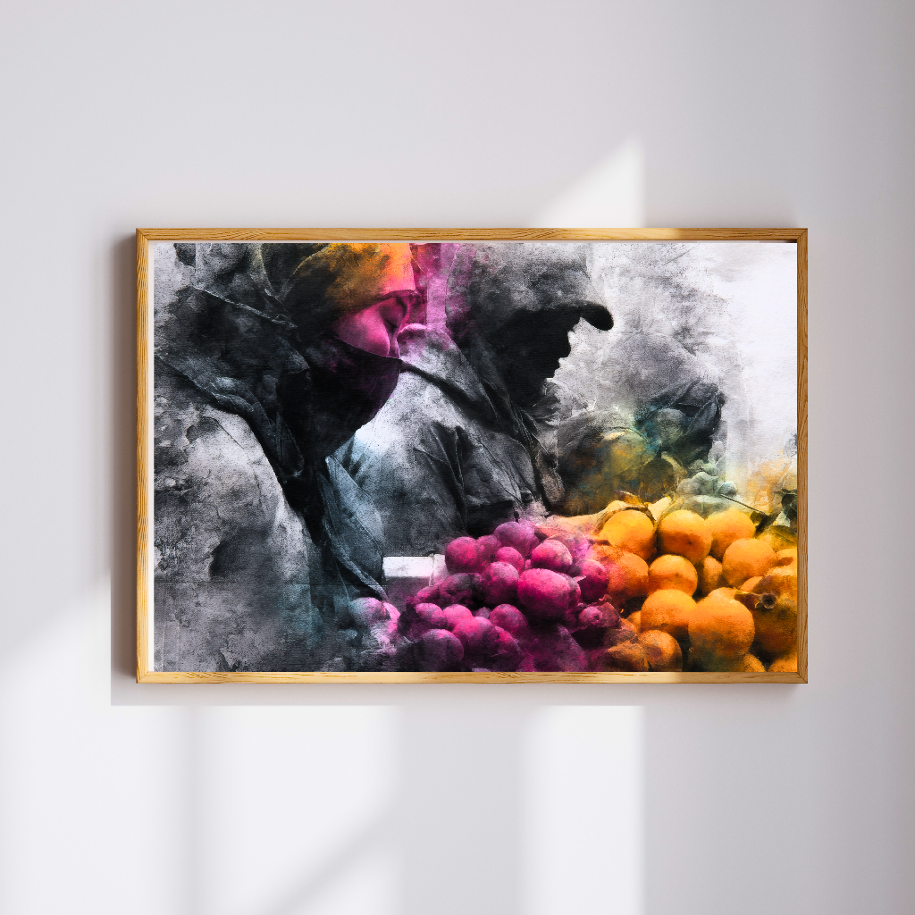 Tags: ai generated art, street scene, charcoal texture, fruit market, contemporary art, cinematic lighting