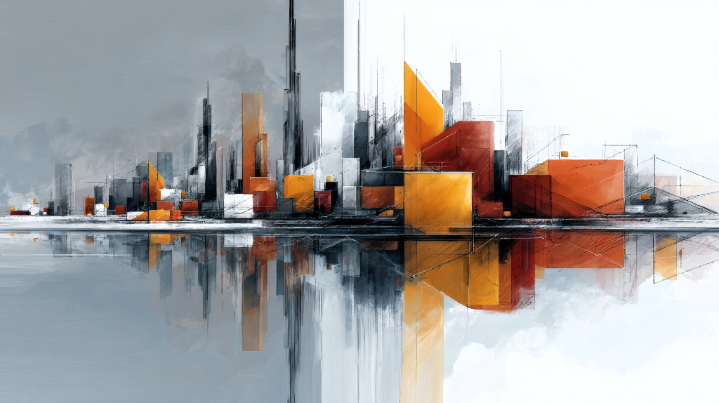 A visually captivating surreal cityscape with geometric forms in orange, crimson, and gray tones, reflecting perfectly on a glass-like water surface. The painting merges clean architectural lines with abstract shapes and vibrant splashes, evoking both futuristic order and creative chaos. Ideal for collectors and contemporary interior design.​