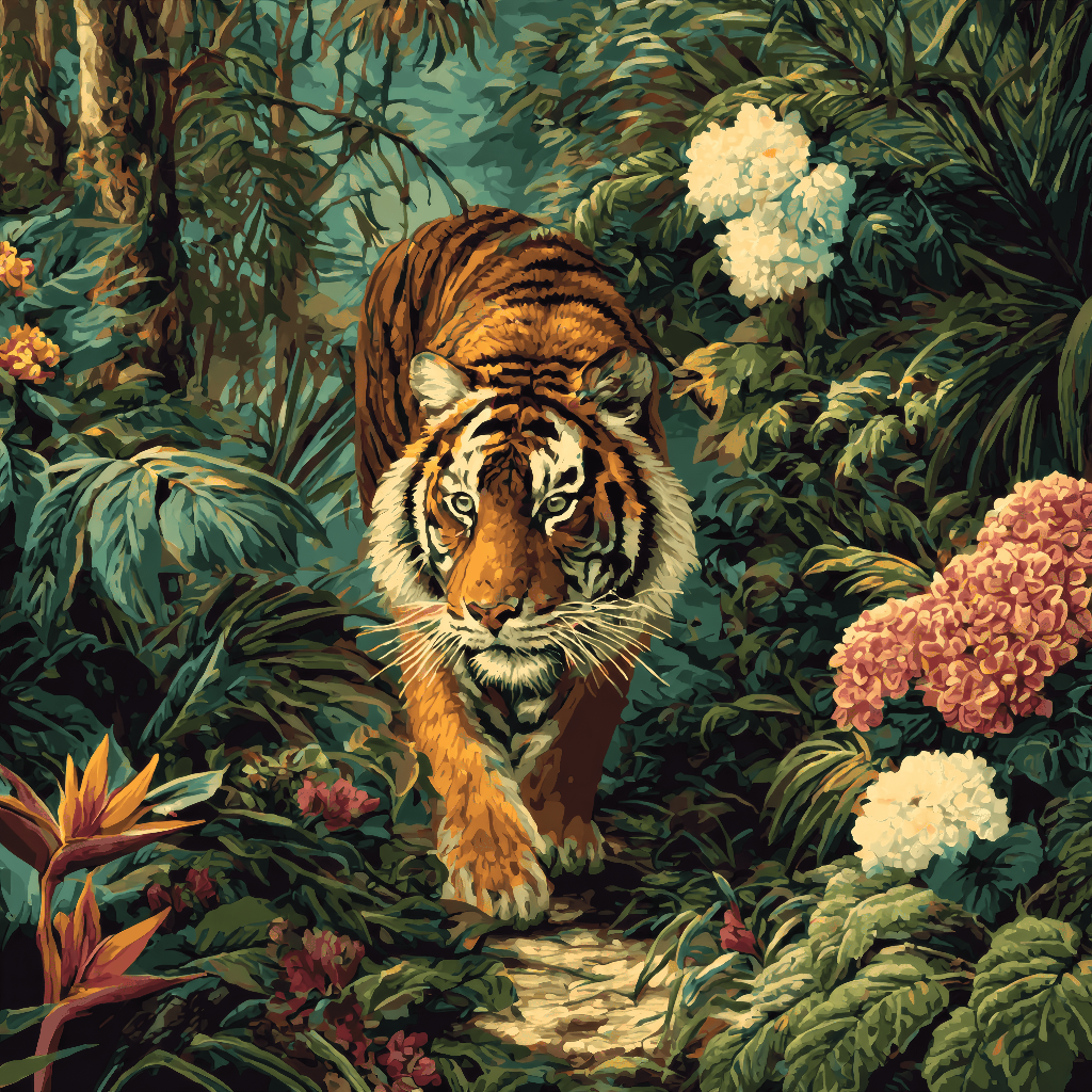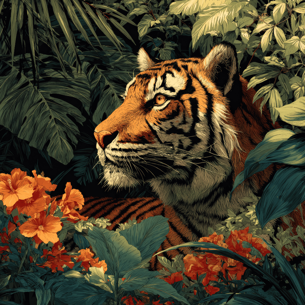 Description: A stunning, hyper-detailed artwork of a majestic tiger nestled amidst lush jungle foliage and vibrant orange flowers. The composition conveys a sense of raw beauty and presence, making it ideal for collectors seeking dramatic wildlife portraits for their décor.​